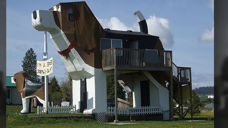Ubicado en Cottonwood, Idaho, el Dog Bark Park Inn es un hotel con forma de beagle gigante que lleva la extravagancia a otro nivel. Este alojamiento, creado por los artistas Dennis y Frances Sullivan, permite a los huéspedes dormir dentro de una estructura de madera de 9 metros de altura con forma de perro, apodada “Sweet Willy”. La decoración interior está repleta de detalles caninos, desde tallas de madera hasta almohadas con motivos de perros.